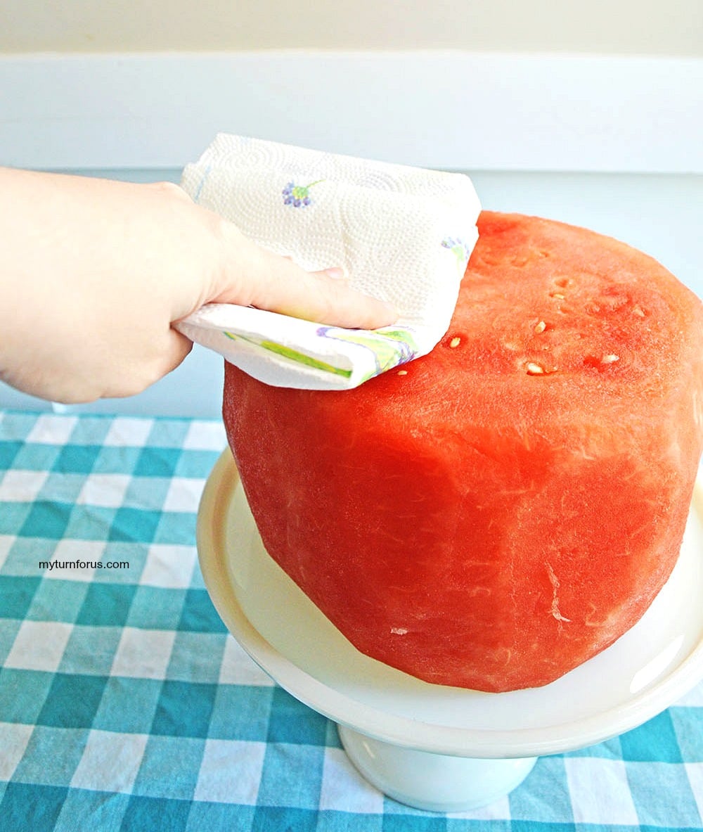 Cut this Watermelon star cake in the same manner as a regular cake and serve it in slices.   It’s a great alternative to sweet sugary cakes for potluck dinners or socials.