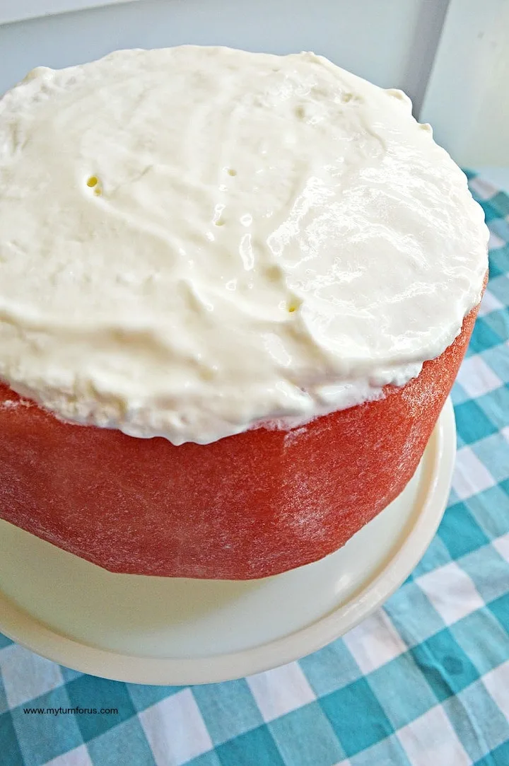Use whipped topping to cover the top of the watermelon slice to resemble frosting on a cake.