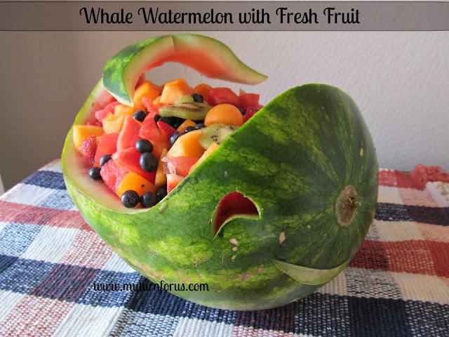 Throughout the years we have made several of these fun whale watermelons as part of our carving melons craze. In the fifth grade, my son’s class planned an “Under the Sea’ party after a session of studying the creatures and fishes that inhabit the ocean and the teacher asked we bring dishes following this theme. My eldest daughter dived into carving a whale watermelon and it was the hit of the party. And of course, because it was filled with healthy fruit also made it a big favorite of the moms.
