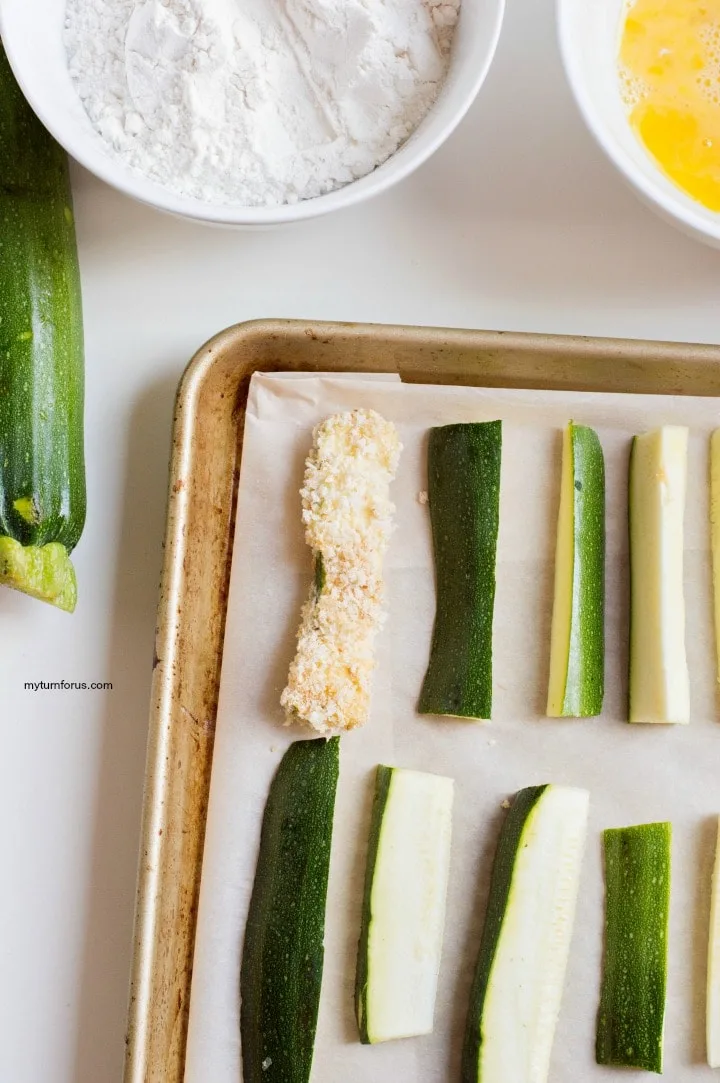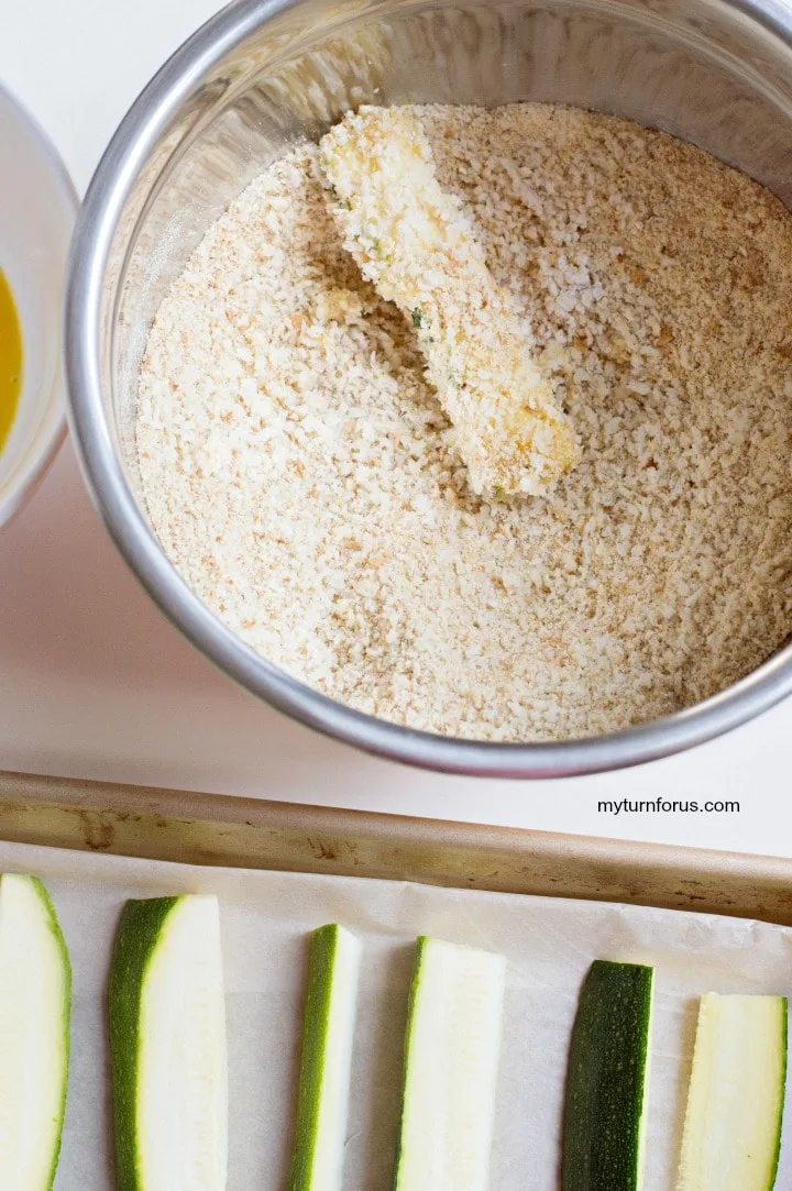 - Place into bread crumb mixture and coat generously. Place back on the lined baking sheet and repeat for every zucchini fry.