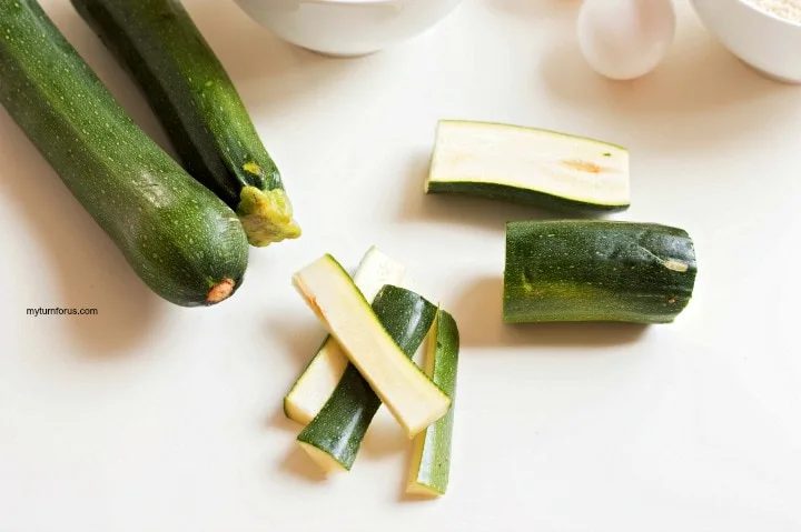 - Cut zucchini into “French fry strips.” To do this, cut off the ends off each zucchini then cut it in half. Then cut zucchini halves in half, lengthwise, then cut into strips. Then place each strip on the lined baking sheets.