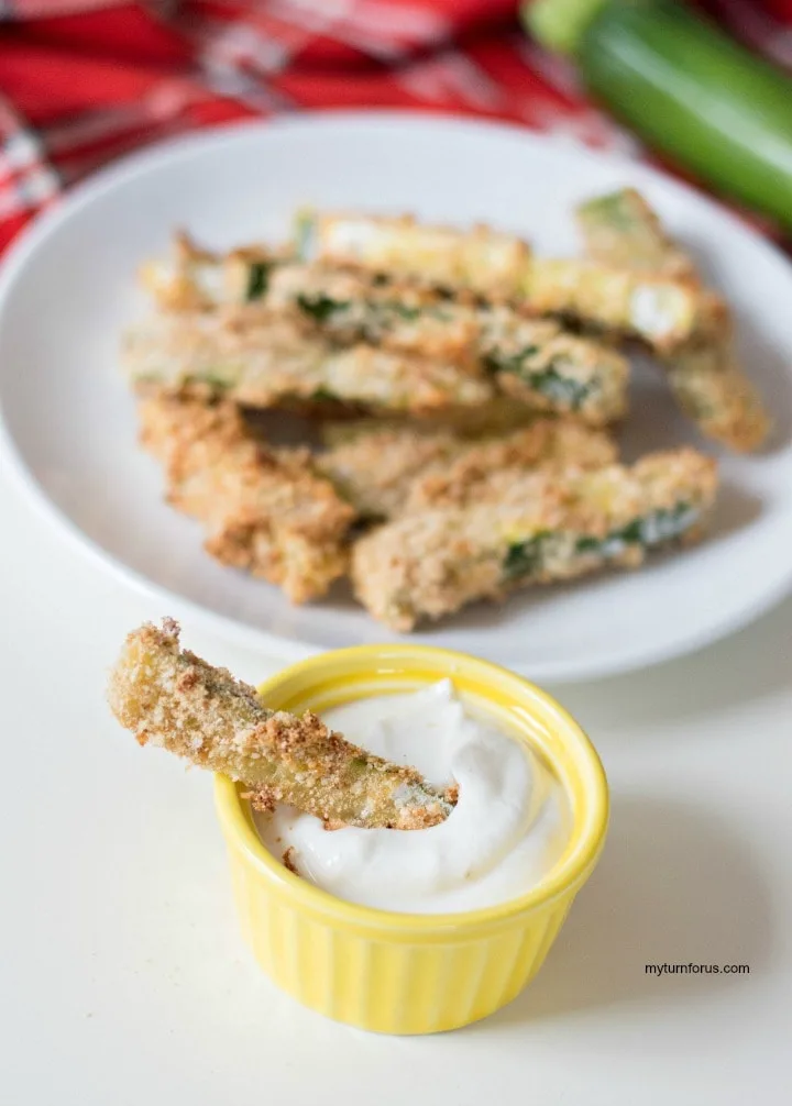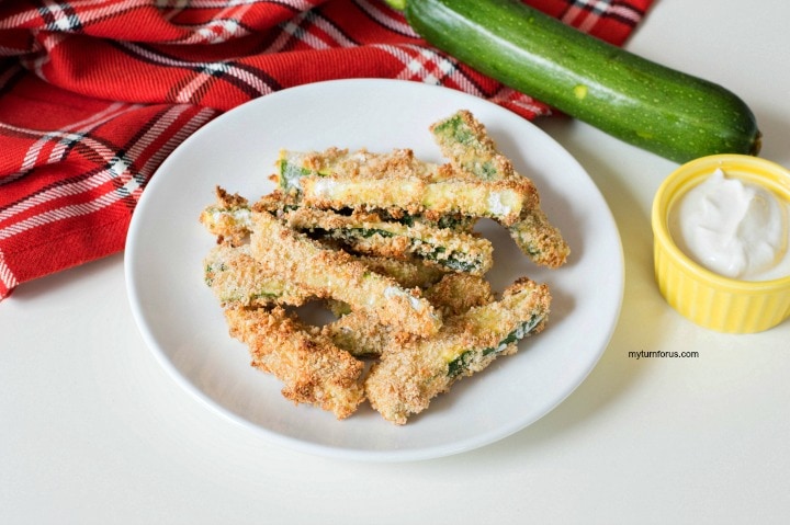 Serve these Oven fried zucchini fries with our homemade fried zucchini dipping sauce. These delicious Panko coated baked zucchini sticks make the most amazing Zucchini appetizers.