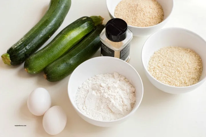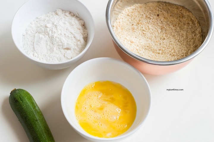 - Place zucchini into the flour and turn to cover completely and then dip it into the bowl of eggs.